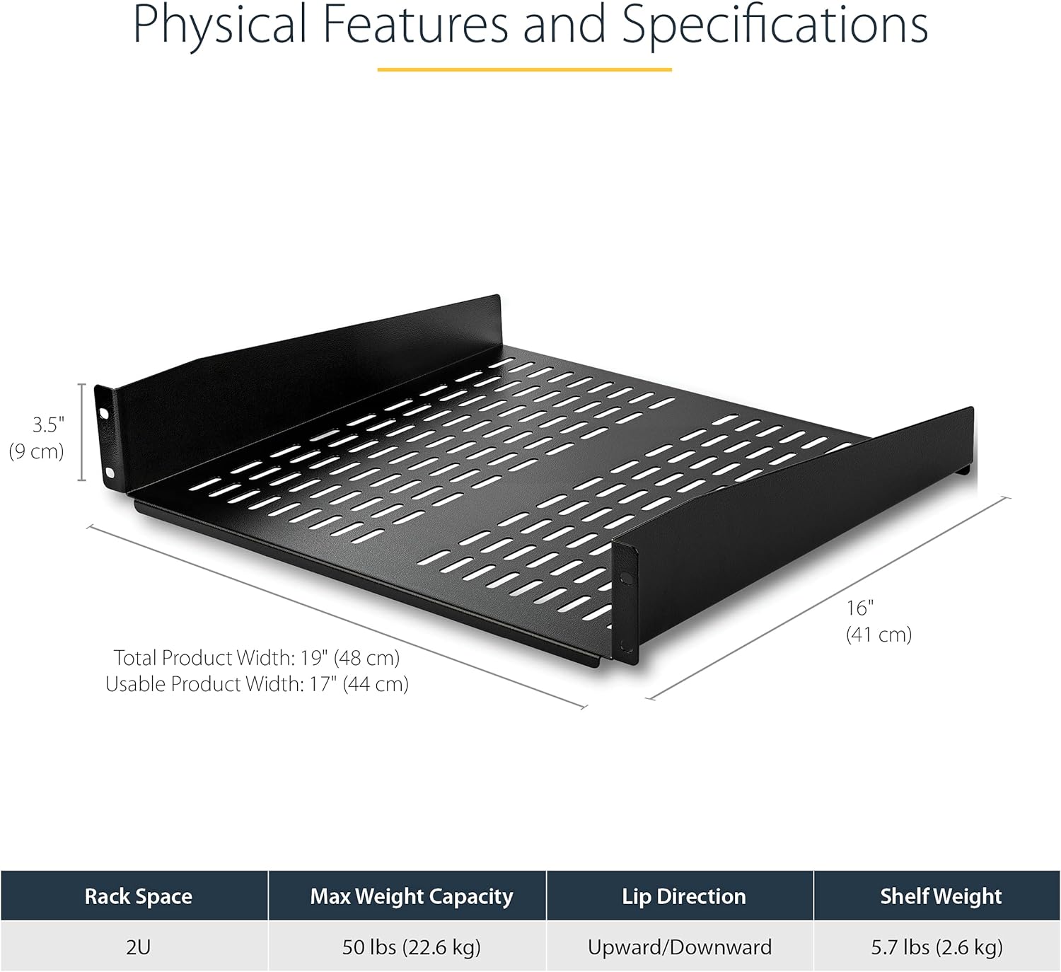 - UNIVERSAL 19'' FIT: This 2U vented server rack mount shelf is designed to fit virtually any 19in server rack and can accommodate an internal depth of 16in (41cm) for your data, IT, networking, or other non-rack mount equipment