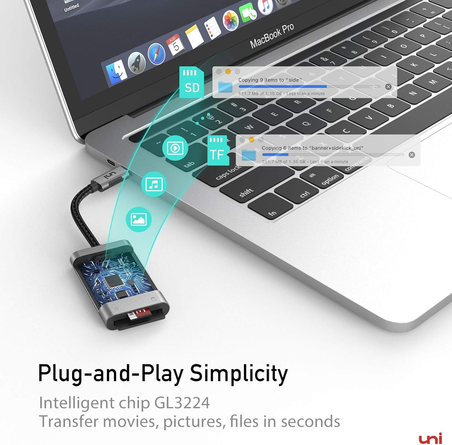 - 【Ultra High-Speed Transfer】Say Hi to uni USB-C SD/MicroSD Card Reader. This Type-C port supports USB 3.0 that can transfer stably data transfer speeds up to 5Gbps and is backward compatible with USB 2.0/1.1. Transfer photos/videos in just seconds. It'll get your transfers moving along at a healthy clip. Note: THE ACTUAL SPEED depends on your devices.