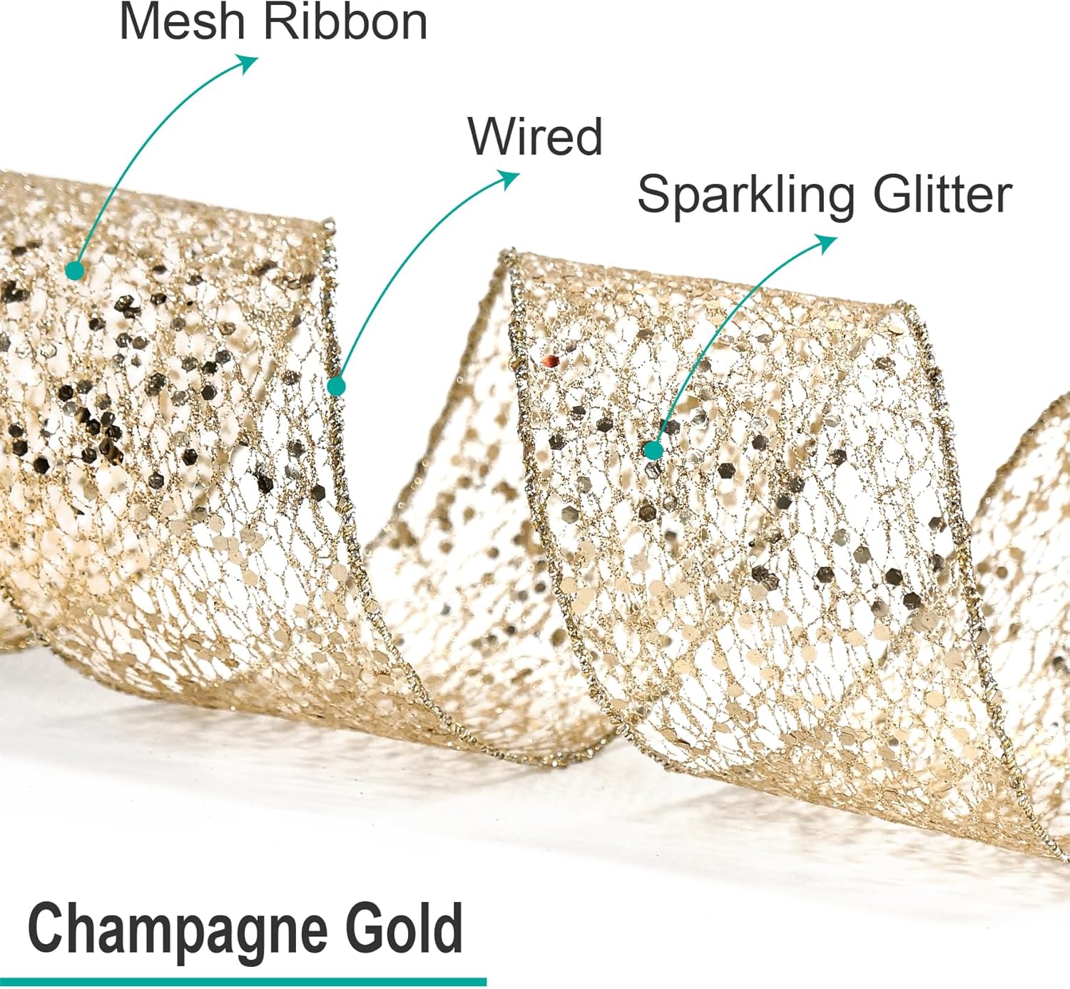- A MUST-HAVE FOR DECORATION - Don't miss it if you're choosing a Sparkling Glitter Mesh Wired Ribbon 2.5" Champagne Gold for your decoration! Our ribbon works perfectly for decorating and adding finishing touch to your craft projects. Simple and elegant.