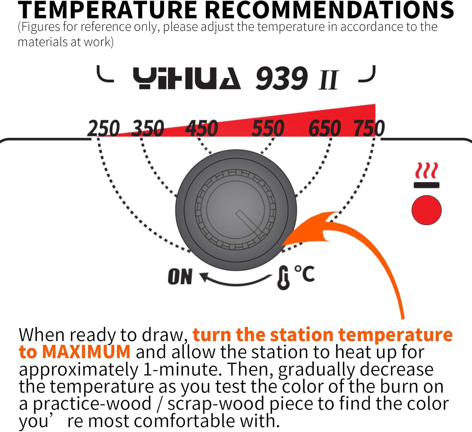 - Wider Temperature Range – This pyrography station’s detachable pen has an adjustable temperature range of 482~1382℉ (250~750℃) via the control knob, and you can use draw on materials with different temperature requirements. The station-design offers better user experience in functions, value, features, and safety.