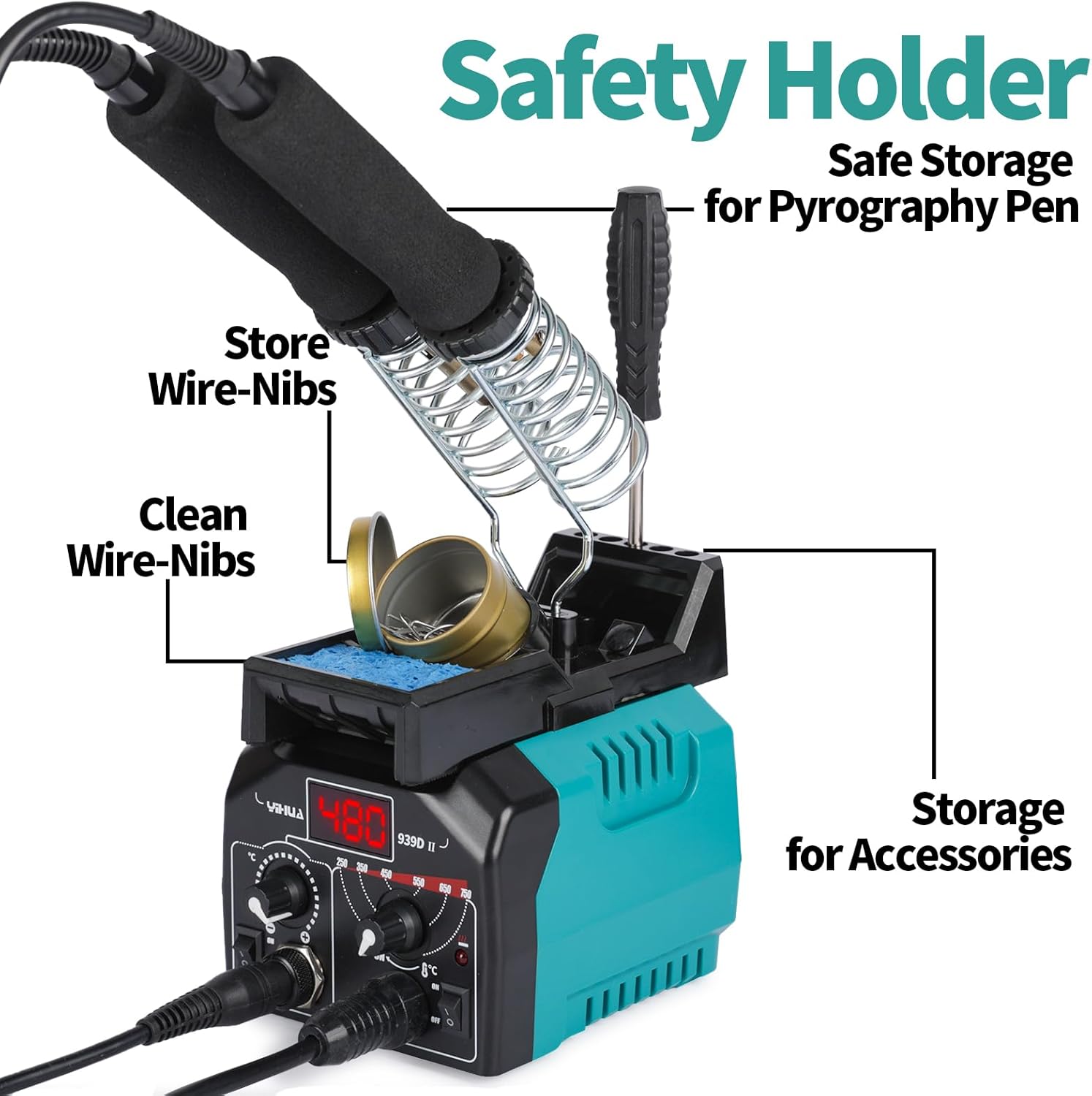 YIHUA 939D-II Pyrography Pen Wood Burning Kit Station 2-in-1 Solid-Point 200~480°C (with Temp Display)/Wire-Nib 250~750°C with 20 Nibs, Solid Points, 1 Stable Pen Holder, 2 Scrap Wood (Green)