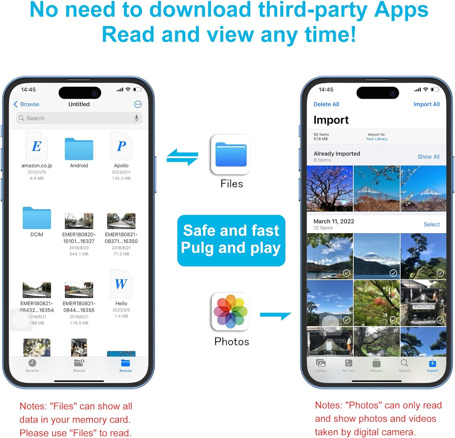 - [Two-way Transfer]: Two-way transfer suitable for iOS 13 -18 device. Import data from SD/TF card to iPhone/iPad, or export the file from iPhone/iPad to SD/TF card. Include Movies, Music, Word, Power point, Excel, PDF, etc.
