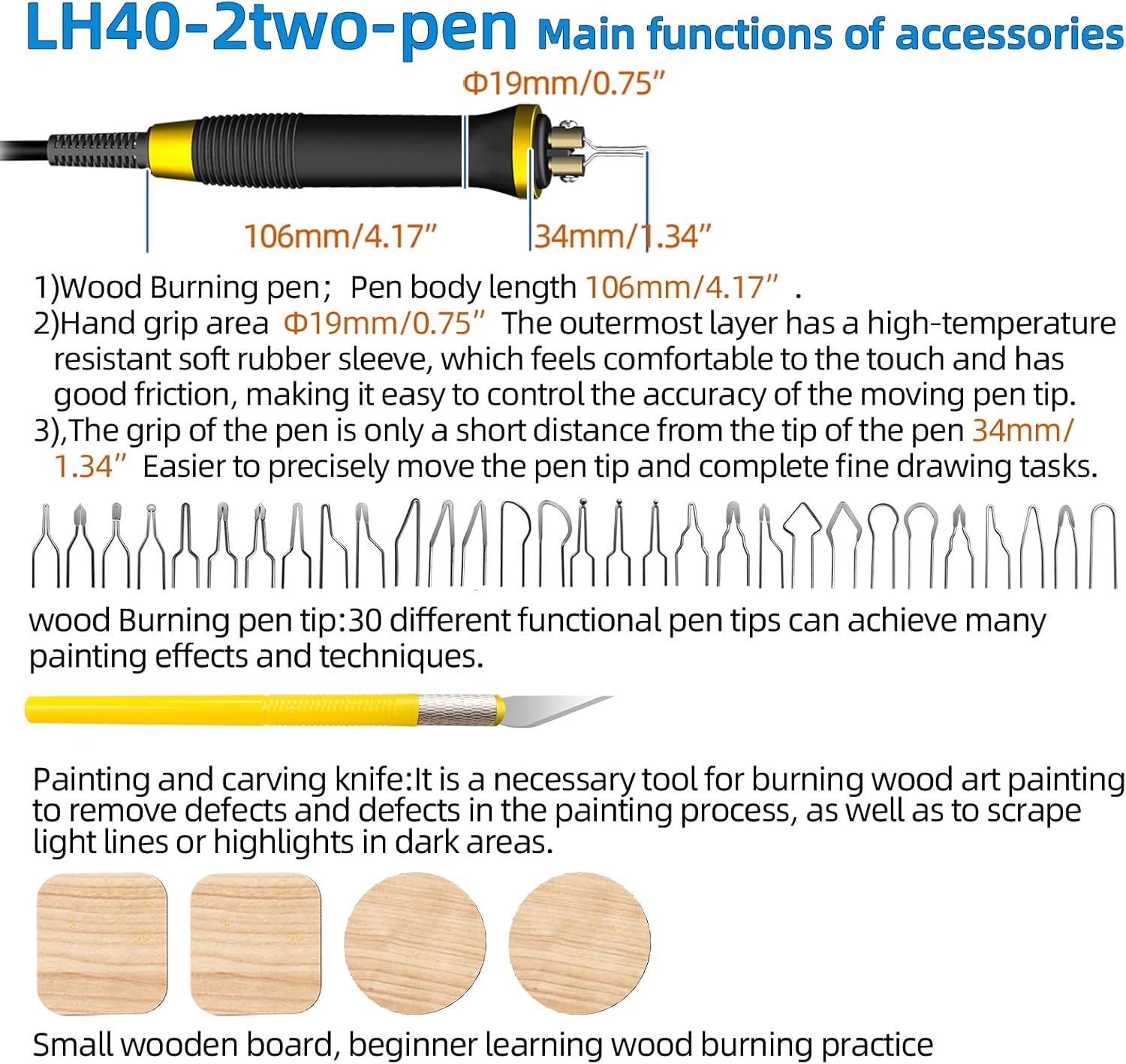 - PROFESSIONAL WOOD BURNING KIT: Wood burning Machine, Two pyrography pens, 30 pen tips, one-pen shelf, one screwdriver, one sponge(Sponge is used to wipe the dirt on the tip of the pyrography pen. When used, the sponge should be saturated with water), small wooden board,engraving pen(The engraving pen is used to scrape and scratch the dark parts of burning wood to lighten some colors and increase the brightness of the picture.), user manual.which will help you to create your pyrography works.Wood Burning Tips is made for a range of like paper, gourd, wood, leather, leaves, bark, straw, Eggshell, deer horn, wheat straw,etc, allowing you to make detailed art.