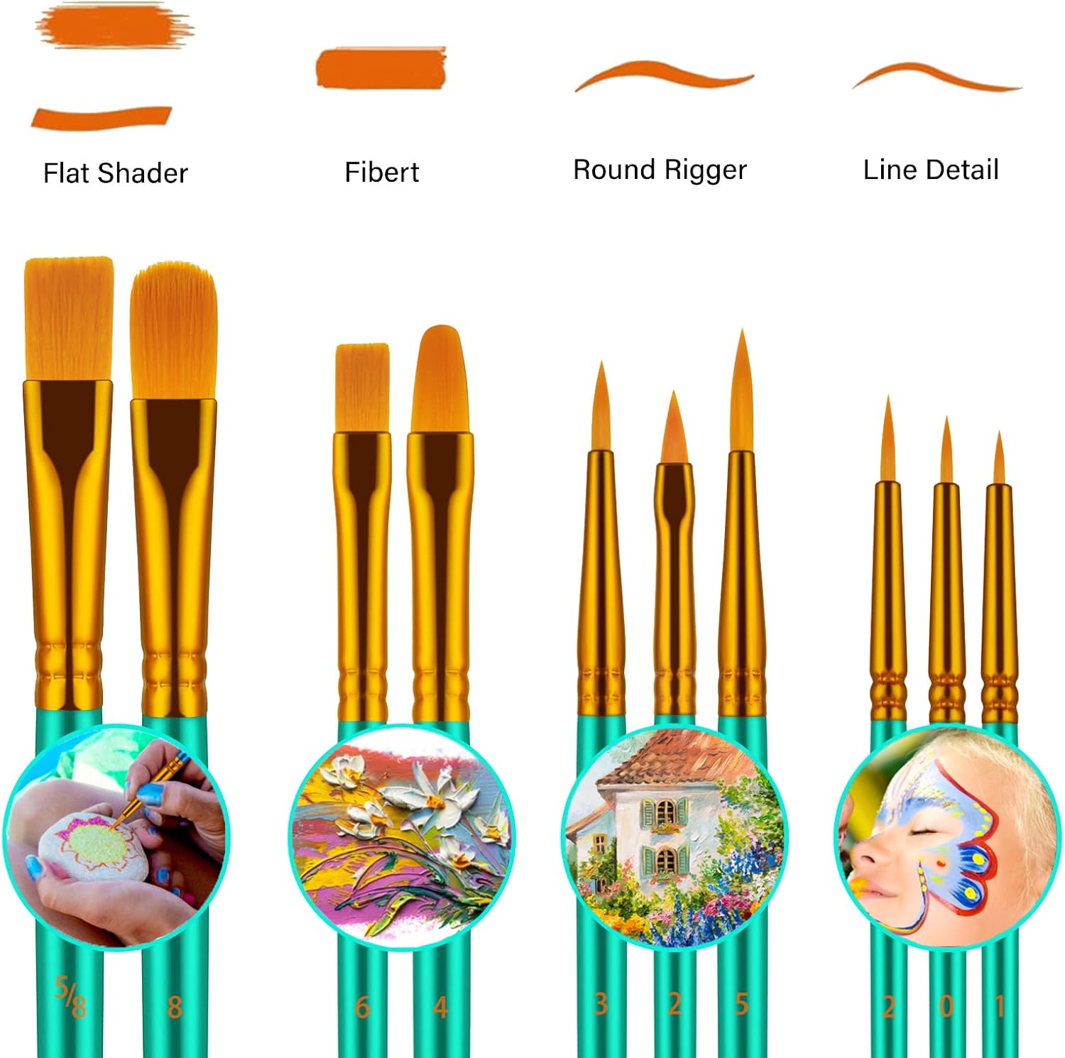 - Multi-purpose Painting Brushes: Assorted Sizes & Shapes of Paint Bush Bulk Perfect for Art Painting, Which Can Cover all Your Needs. Works Well with Art, Watercolor, Oil, Canvas, Gouache, Rocks, Vinyl, Acrylic Painting, Body, Nail, Face Painting, Fabric, Egg, Miniature, Model, Wood, Glass, Cup, Ceramic, Fine Work, Art Class, Craft Art Painting, DIY Art Crafts etc. Acrylic Paint Brushes Allow You to do Fine Detail Painting Precisely to Reach Tight, Small Spots or Tiny Points.