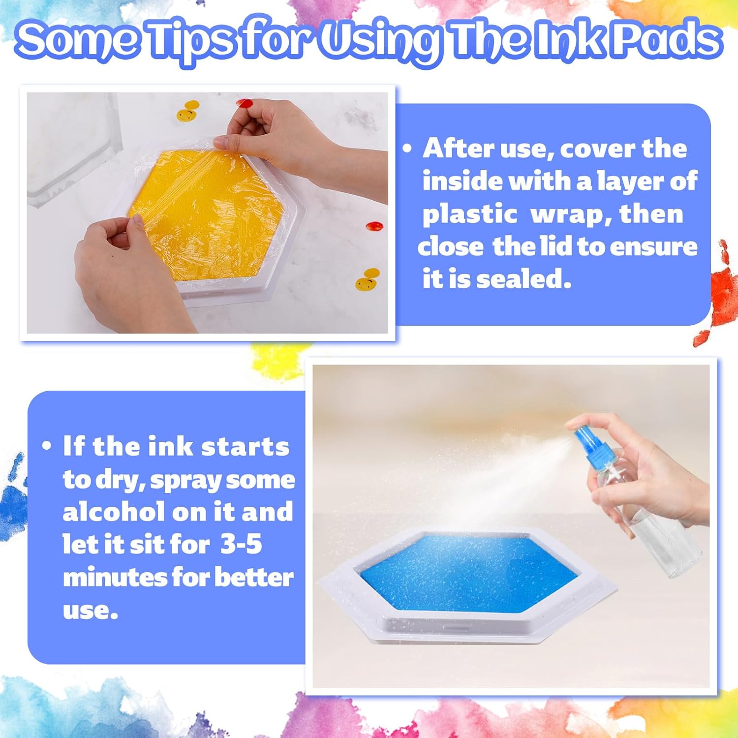 - 【Safe Material】Our ink pads are made from environmental pigments, which are safe and harmless for use. The ink is so easy to clean off from the skin that children can use these alone with no worry. Tips: After use, cover the inside with a layer of plastic wrap, then close the lid to ensure it is sealed. Store in a cool, airtight place. If the ink starts to dry, spray some alcohol on it and let it sit for 3-5 minutes for better use.