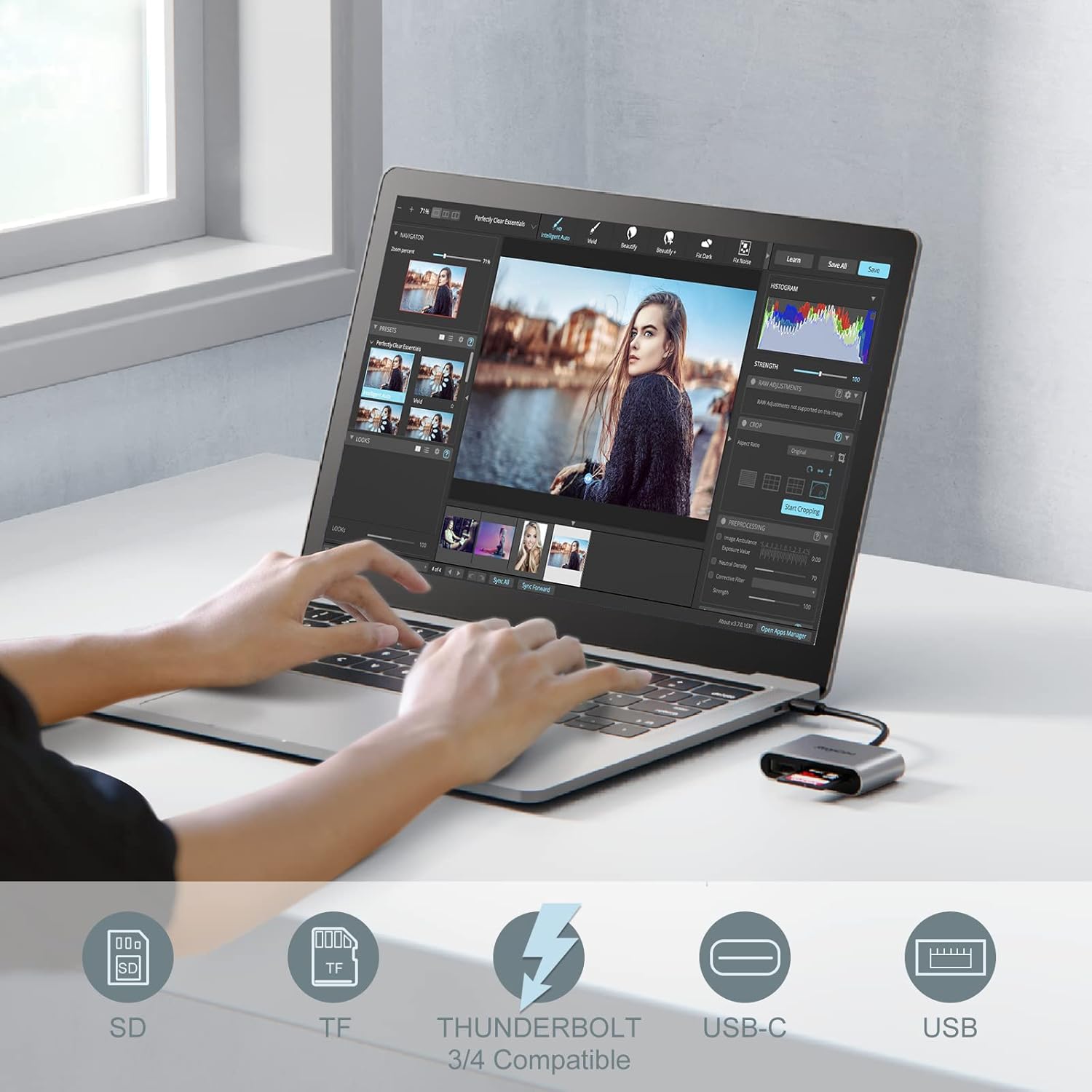 - 【Plug and Play】 This USB C SD card reader does not need to download Apps, plug and play. Portable and easily Transfer the photos and videos to your USB C device from SD / TF Card or other USB 2.0 device. High-Speed Transfer with the speed of 14MB~16MB/S. With the card reader, share videos or pictures with others at any time. No need to use a PC anymore, Fast and easy.
