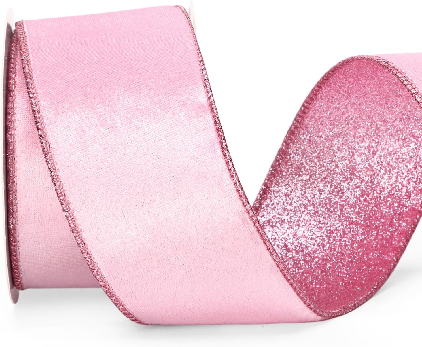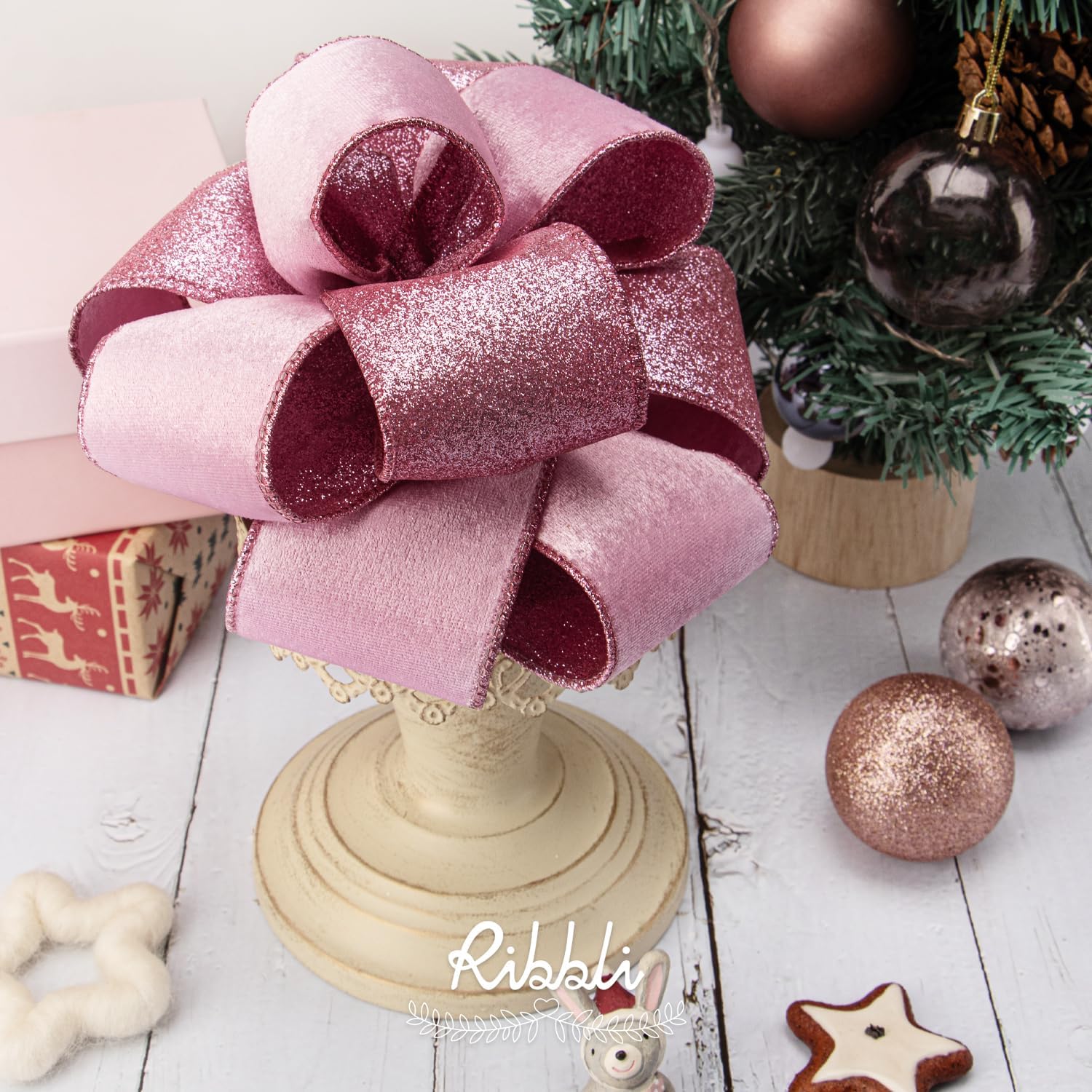 Ribbli Pink Velvet Wired Ribbon 2.5 Inch Velvet with Glitter Christmas Ribbon for Tree Decoration Big Bow Gift Wrapping Crafts Wreaths Supplies - 10 Yards