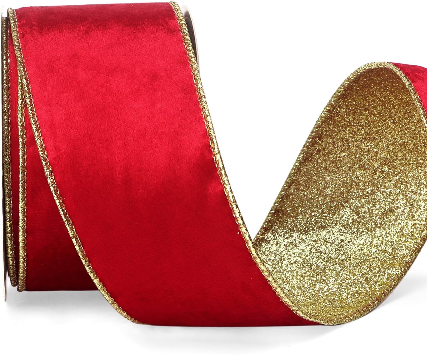 Ribbli Red Velvet Wired Ribbon 2.5 Inch Red Velvet with Gold Glitter Christmas Ribbon for Christmas Tree Decoration Big Bow Gift Wrapping Crafts Wreaths Supplies- 10 Yards