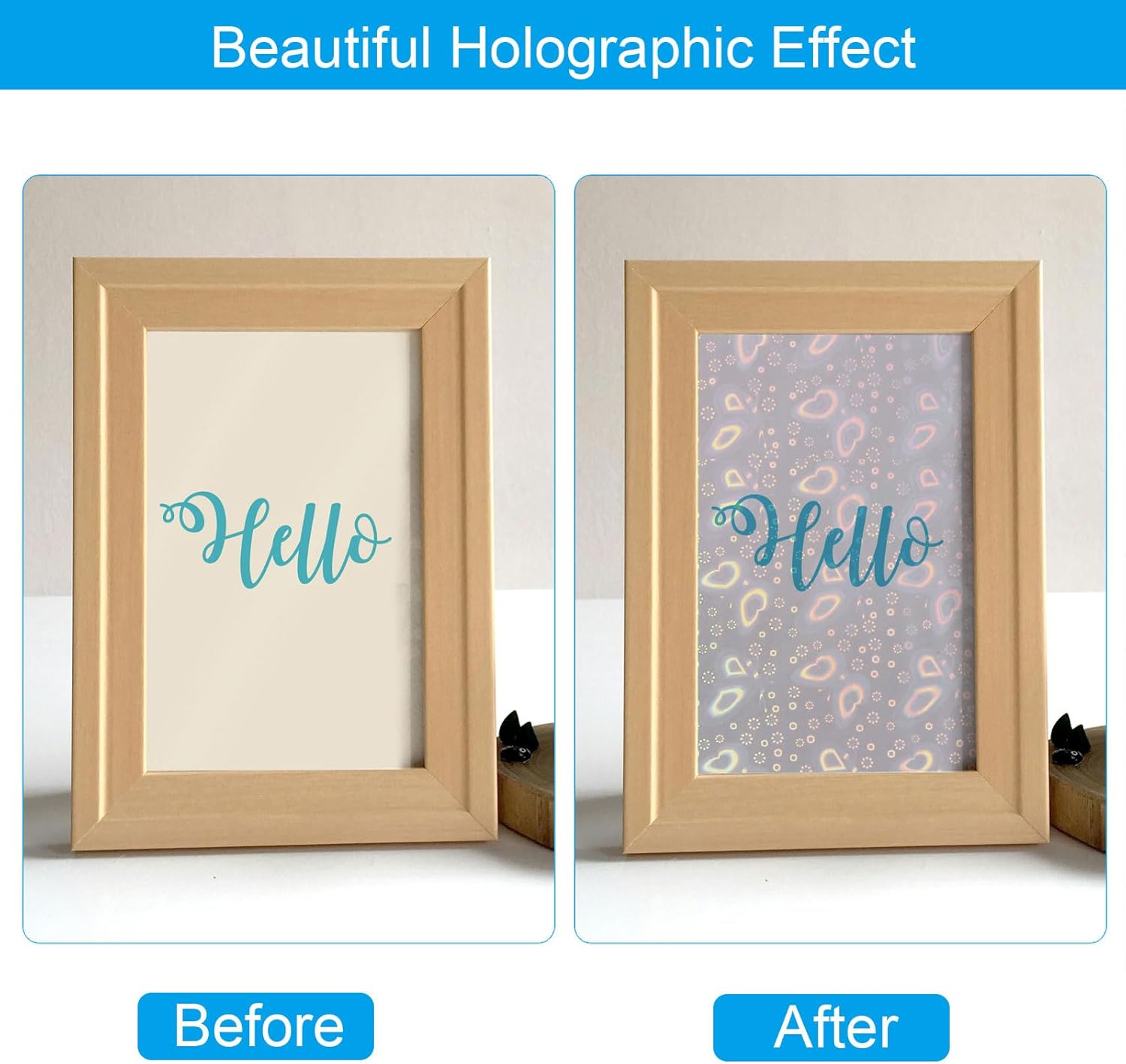 - The holographic sticker paper is great for decorating photos, scrapbooks, laptops, cellphone covers, gift cards, decals, posters, signs, boxes, water bottles, letters, books, murals, envelopes, etc. It is also suitable for home decoration, such as beautifying window, door, mirrors, or most of surfaces that are smooth, flat, and dry, such as metal, plastic, glass, cardboard, paper, and so on.