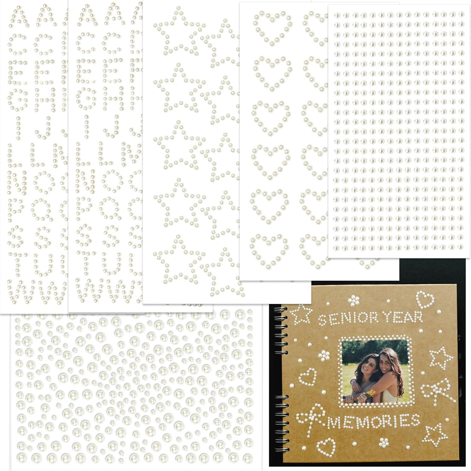 - Assorted Craft Pearls: Includes 6 sheets pearls in 4 styles; 2 sheets of letter stickers, 1 sheet of star stickers, 1 sheet of heart stickers, 1 sheet of pearl chains, and 1 sheet of single pearls, offering a variety of options for combinations