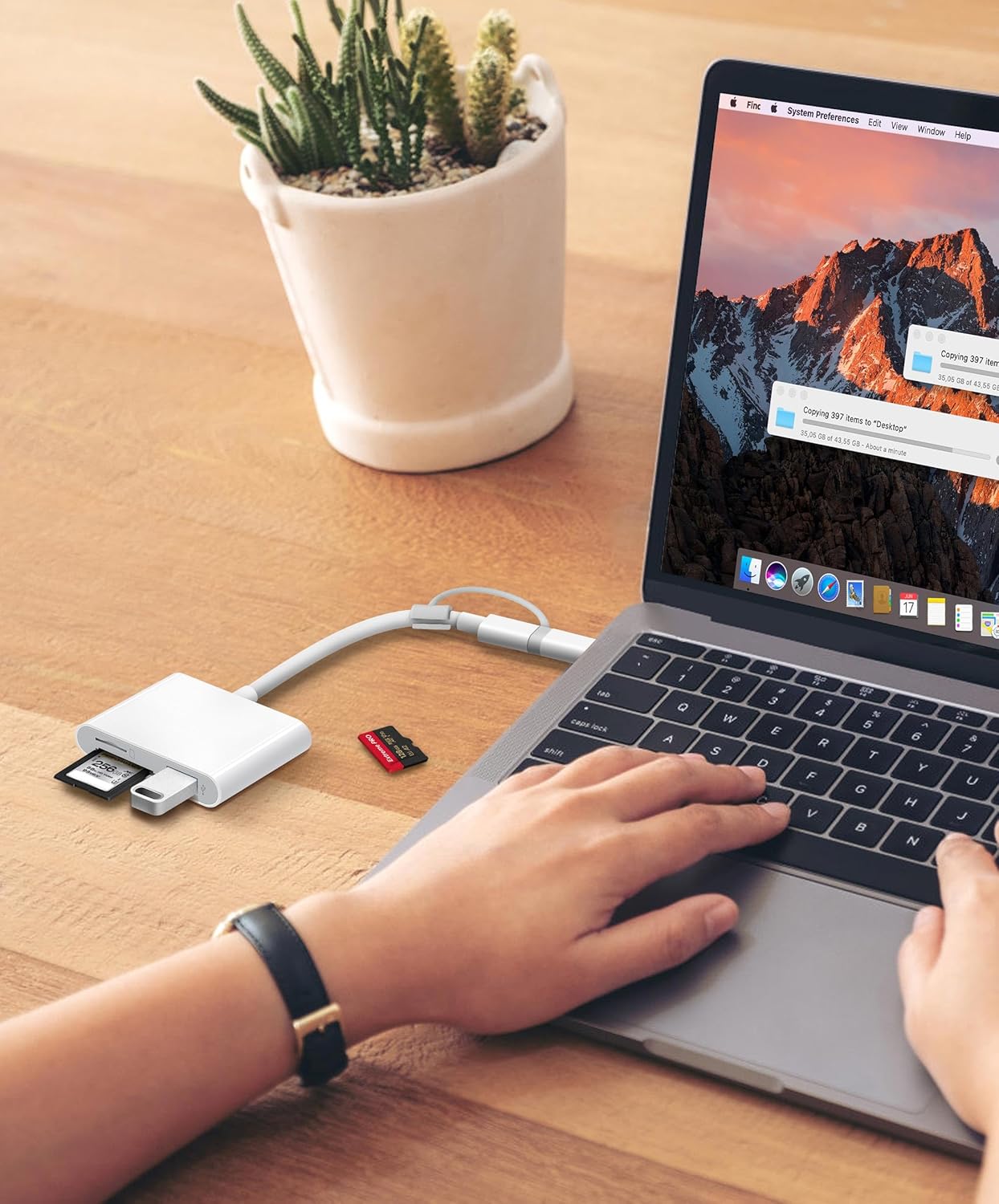 - DUAL-CONNECTOR DESIGN: The AkHolz SD card adapter features both Lightening and USB-C port capability (comes with a USB-C to Lightening adapter), plug the USB-C end of the adapter into the USB-C connector on your iPhone or iPad, then connect the Lightening card reader. Lets you to connect to USB-C enabled iPhone 15, iPad, Mac or even Android and Pcs to conveniently provide data OTG functionality. The AkHolz dual-connector SD adaptor also lets you to go back and forth from your Android Windows to Apple devices, transferring video or whatever else.