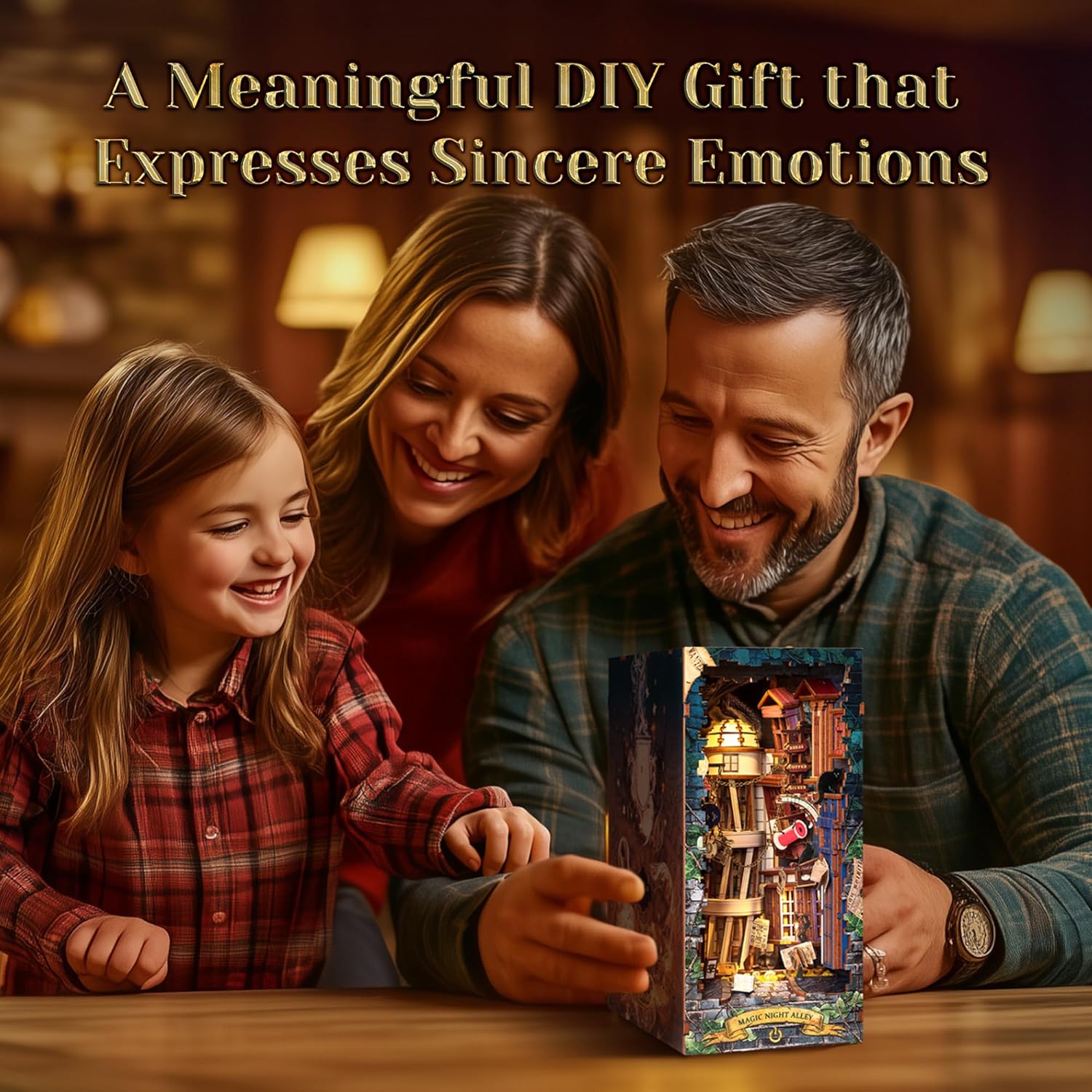 3D Wood Puzzle Book Nook Kit, DIY Magical Miniature Dollhouse with LED Light, Magic Night Alley Bookshelf Insert Bookend for Display, 3D Puzzle Craft Set for Adults(Magic Night Alley)