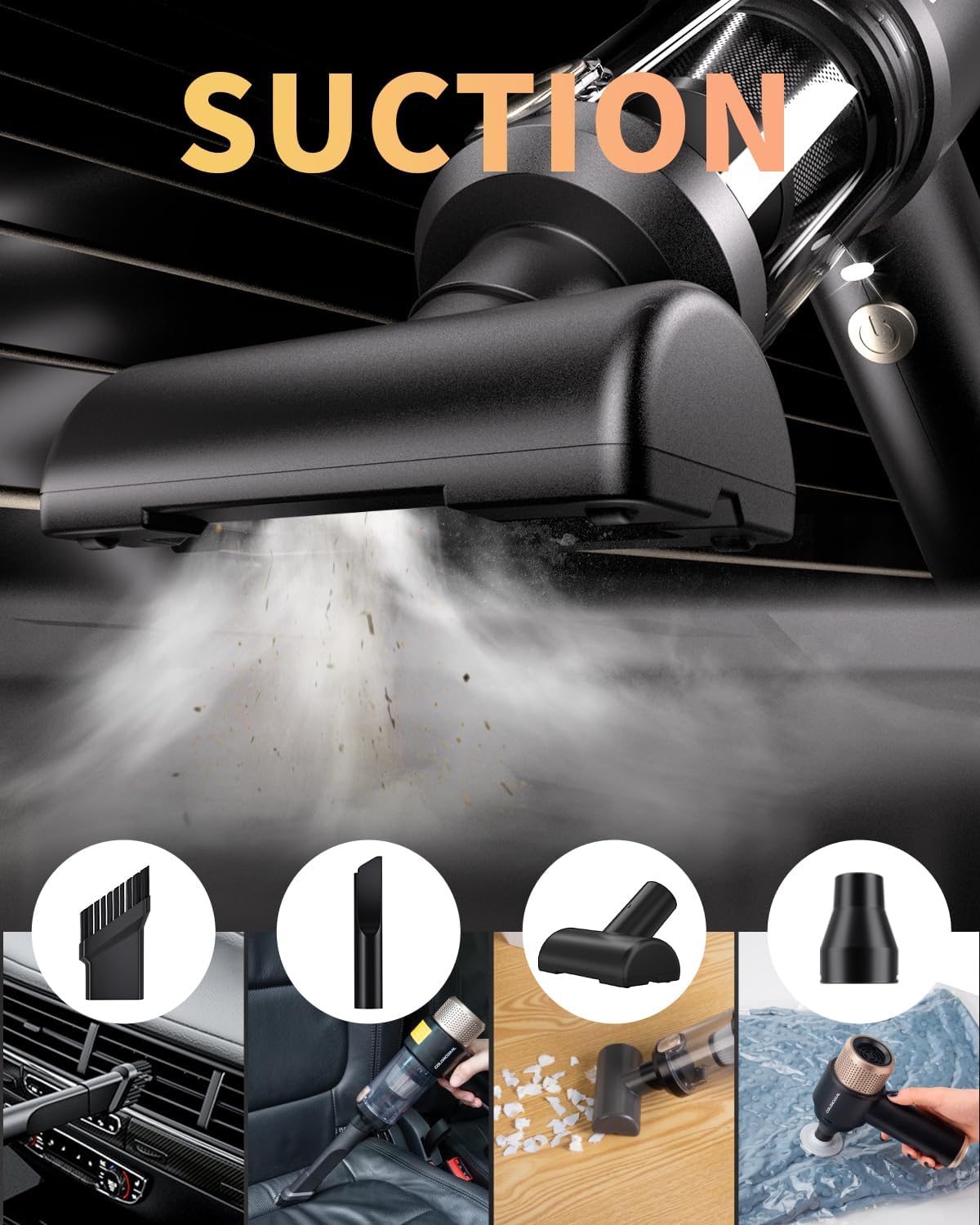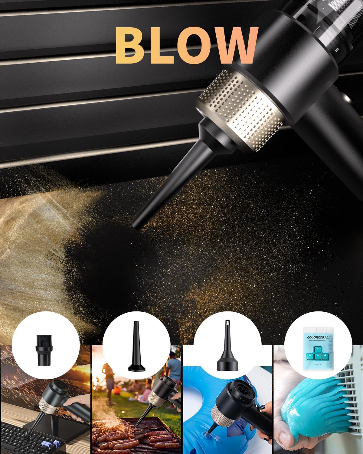 - 🌀【4 in 1 Mini Vacuum Cleaner】: COLORCORAL handheld vacuum is equipped with vacuuming,blowing,inflating and pumping,multi-functional design makes cleaning more efficient.With different brush heads and nozzle attachments,whether you're dealing with crumbs on your desk,dust on your laptop keyboard,or debris in your car interiors,this mini vacuum cleaner cordless ensures thorough cleaning in seconds.Ideal for keeping your mini hoovers cordless powerful.
