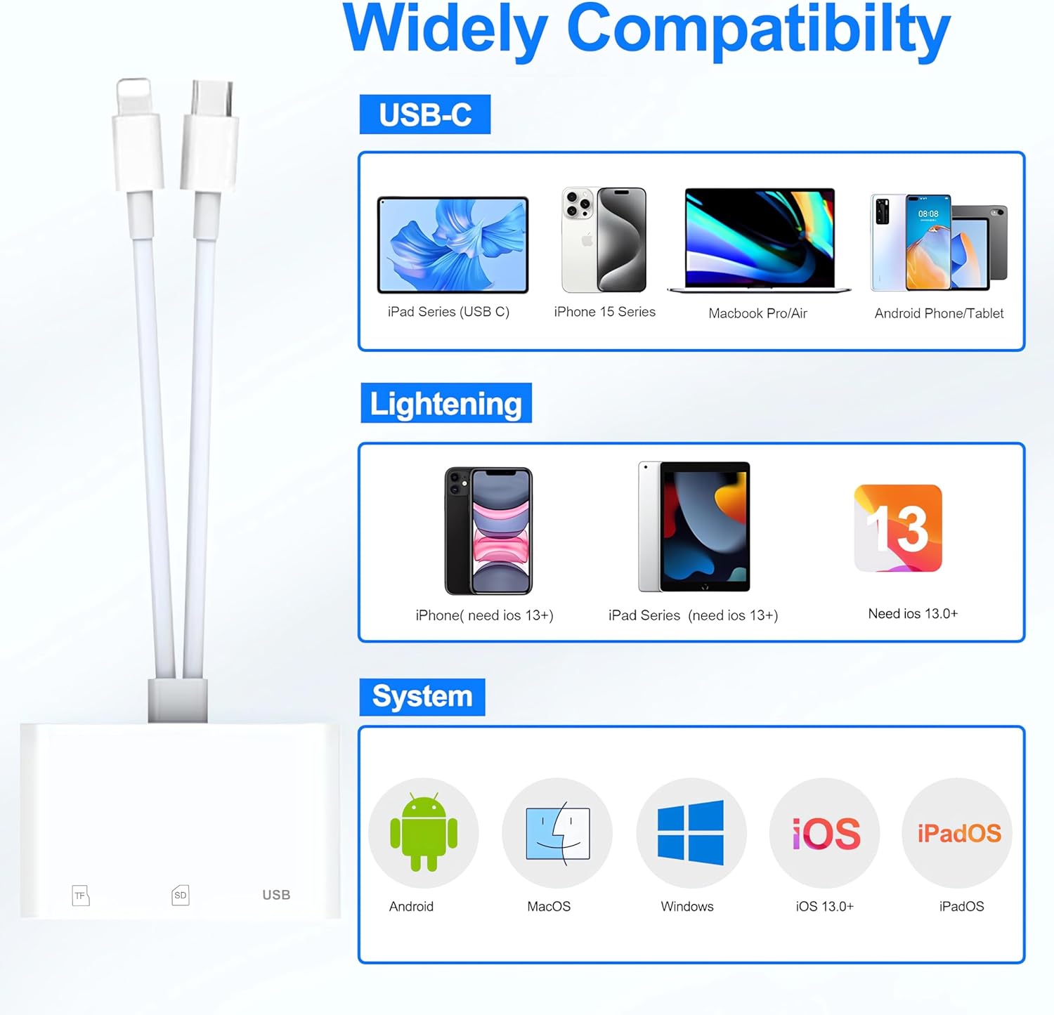 - SD Card Reader for iPhone Phone: Denlane upgraded SD card reader has dual connectors (usb c & lightning), for apple iphone 5-14, iphone 15-16, ipad, mac, andriod phone, table type c devices. Note: two connector cannot be used simultaneously