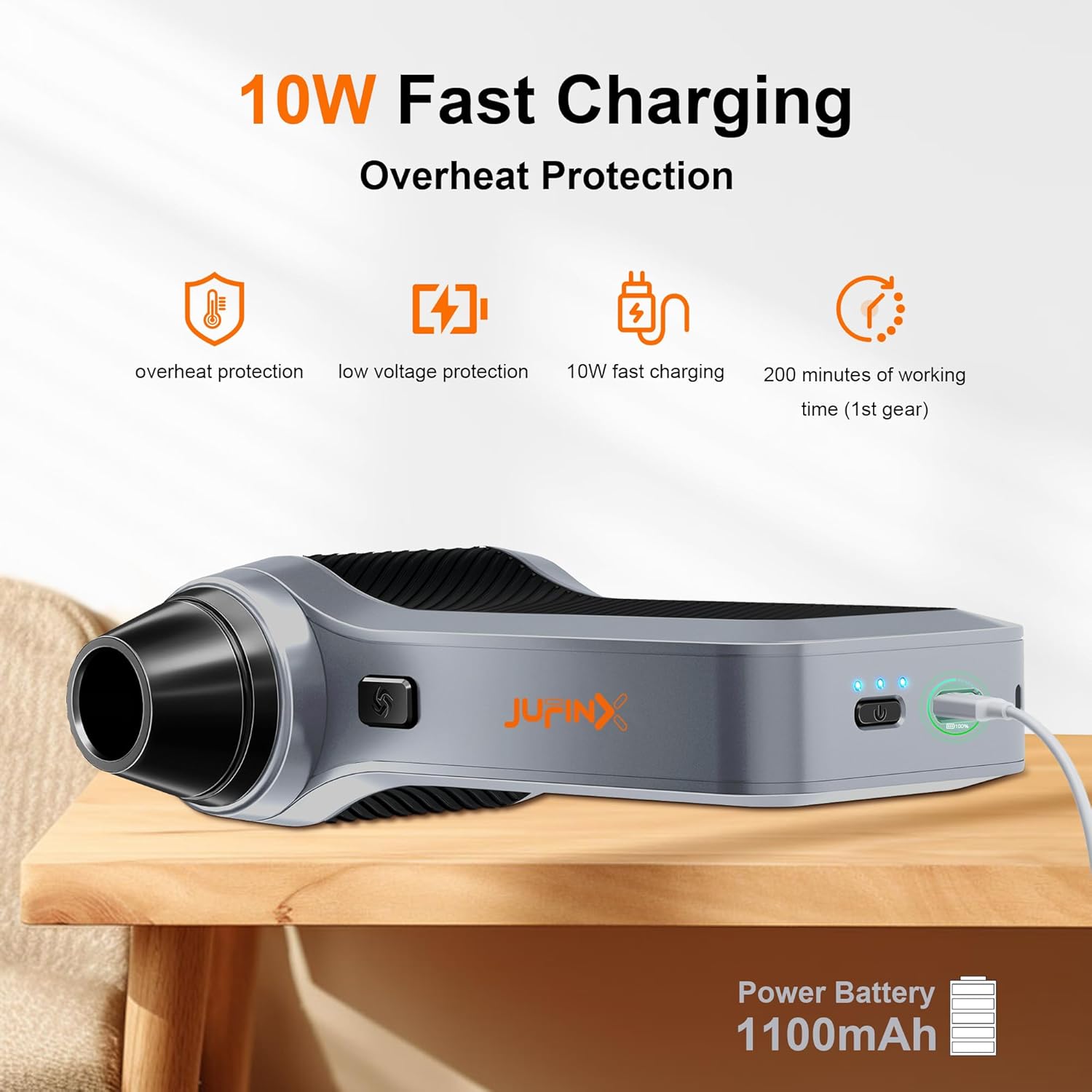 - 【Fast Charging】This electric compressed air duster feature a built-in 1100MAH battery with 150° over heating temperature protection,current short circuit protection supporting fast charging up to 10W,fully charged in about 2.5H (first gear usage time: 200 minutes (1st gear)). Minimizing downtime and ensuring you're always ready for action.