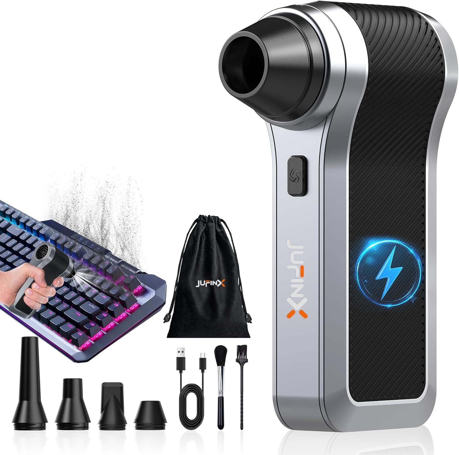 - 【 Electric Air Duster】JUFINX compressed air duster with 130000 RPM brushless motor delivering 150G wind pressure with a max wind speed of 48 m/s. This Mini Blower quickly and efficiently clears dust, dirt, and debris from keyboards,electronics,and hard-to-reach areas. It is a perfect choice for dust cleaning at home, office,outdoor and automobiles.
