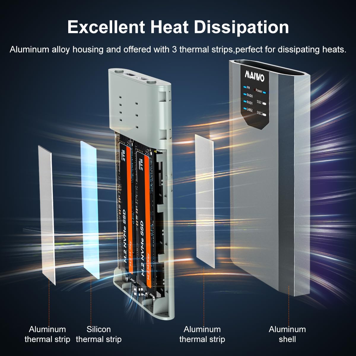 MAIWO Dual M.2 NVMe SSD Enclosure with 4 RAIDs, M.2 NVMe PCIe RAID Enclosure Supports RAID0/1/PM/Large, USB 3.2 Gen2x2 Type-C 20Gbps Speed, 8TB Capacity