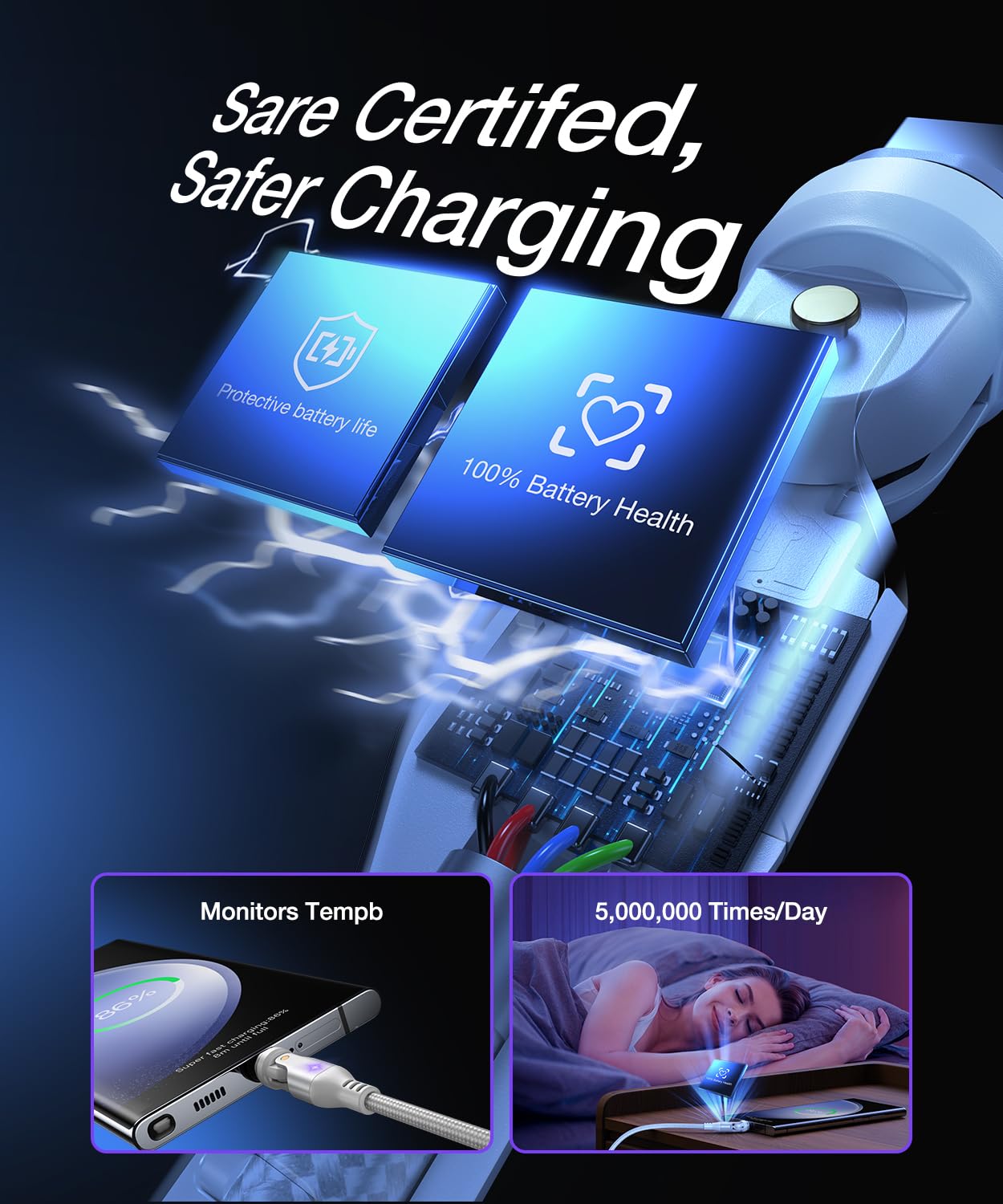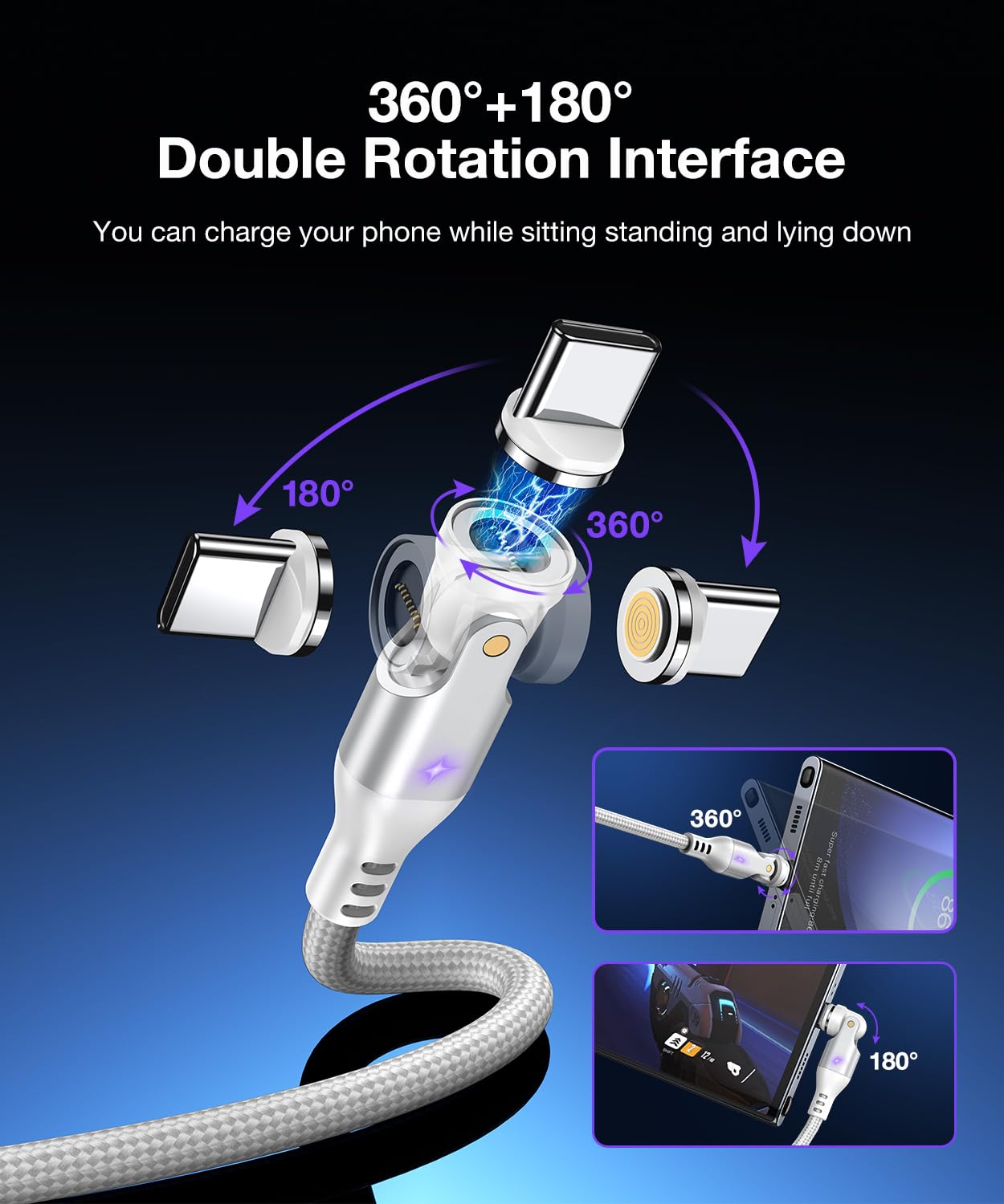 - ๐๐๐ยฐ+ ๐๐๐ยฐ๐๐๐๐๐๐๐๐ ๐๐๐๐๐๐: Discover the ultimate flexibility with our Magnetic Phone Charger, a magnetic charging cable that redefines convenience and protection. With a remarkable 540-Degree Rotation capability, the magnet tip of our Magnetic Charger Cable can rotate a full 360ยฐ, while the charging head bends an impressive 180ยฐ. This innovative design allows you to adjust the charging angle effortlessly, accommodating any situation and ensuring optimal charging alignment.