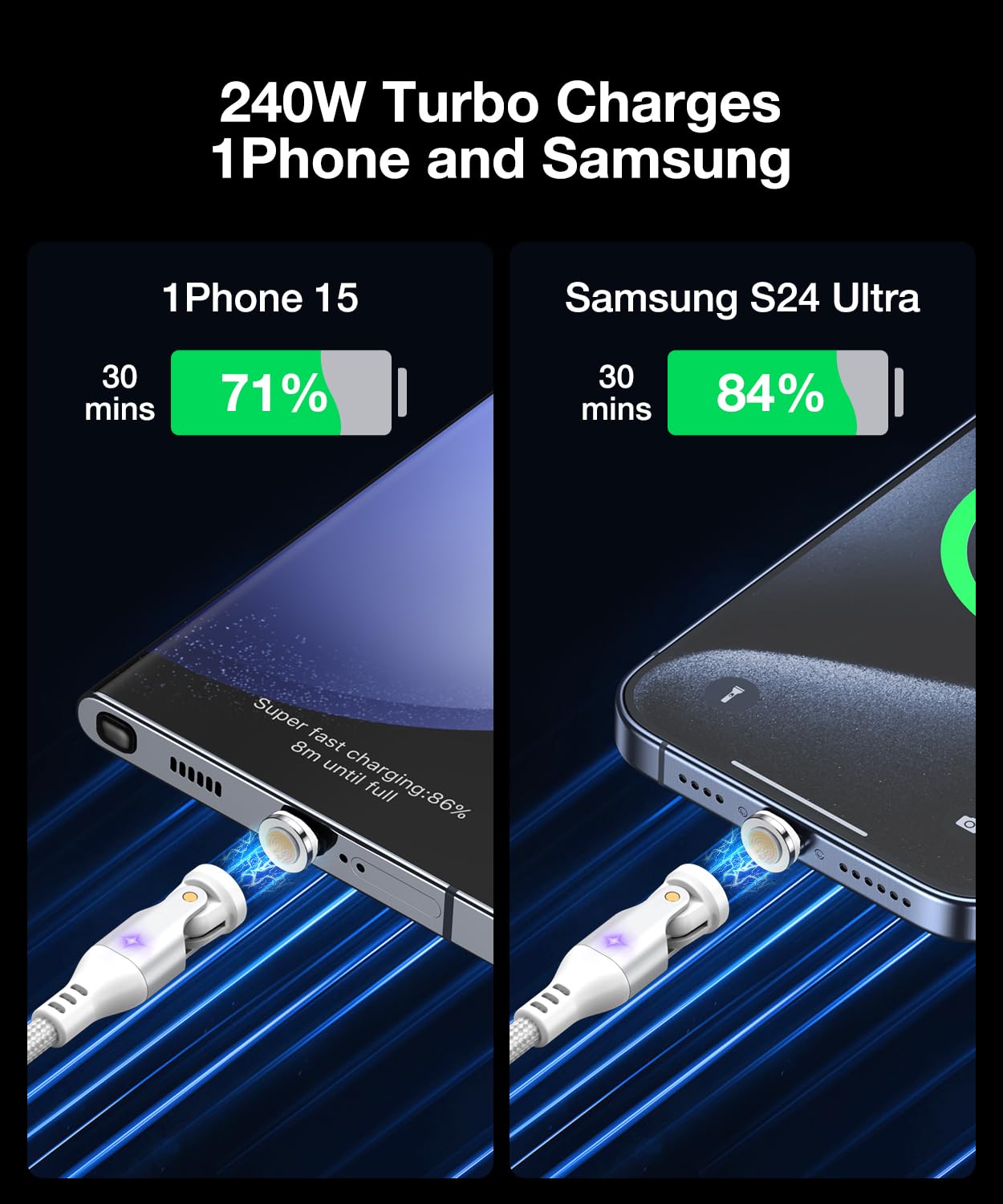 - ๐๐๐๐-๐๐๐๐๐๐ ๐๐๐๐๐: Harness the power of 240W charging and USB Power Delivery Technology. The magnetic charging cable type c your devices swiftly, saving you time and ensuring you're always connected. It can fully charge a Phone 15 96%, a Switch 90%, a Samsung S23 96%, a McBook Pro 86% and an Pad Pro 89% in 35 minutes. No more idling while a battery charges slowly. NOTE: Please be aware that a C port adapter with the appropriate power is required.