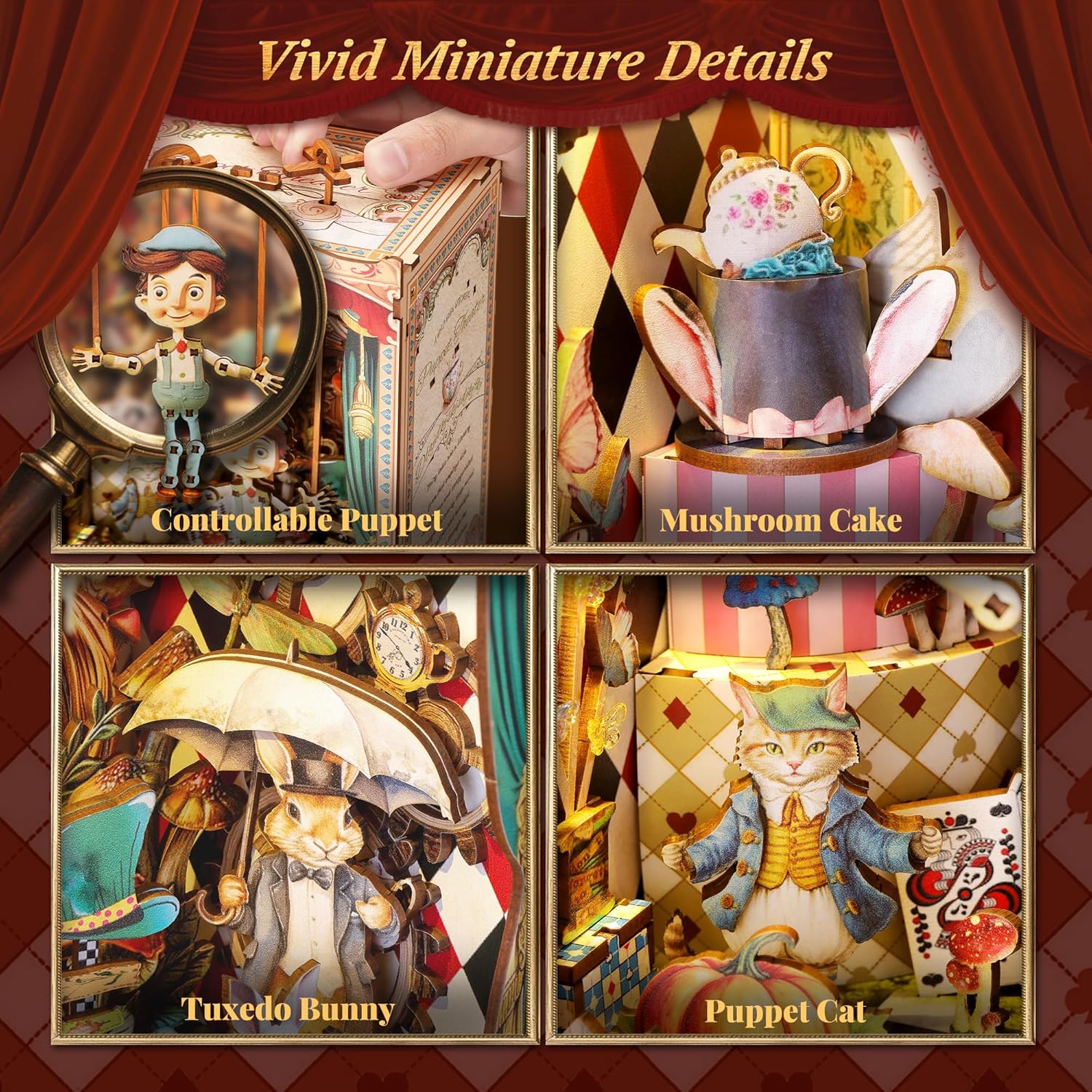 - 【Whimsical Lighting & Miniature Detail】Built-in LED lights cast a warm theatrical glow, highlighting every intricate detail—from mushrooms and puppet cat to playing cards and velvet curtains. It became a true feast for the eyes once been completed.