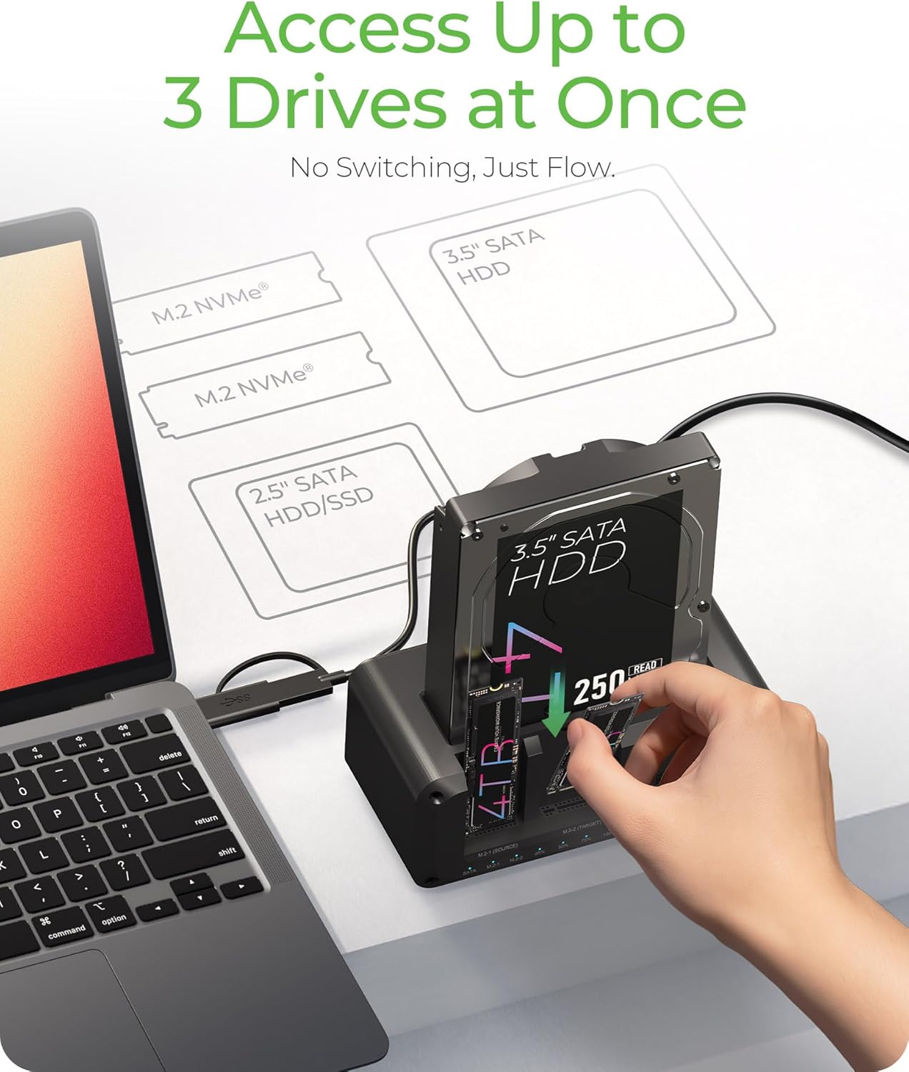 - Versatile Triple-Bay Design: Equipped with three independent slots, allowing you to connect and access multiple drives simultaneously. The tool-free design makes swapping and docking drives fast and convenient, ideal for professionals managing diverse data sources.