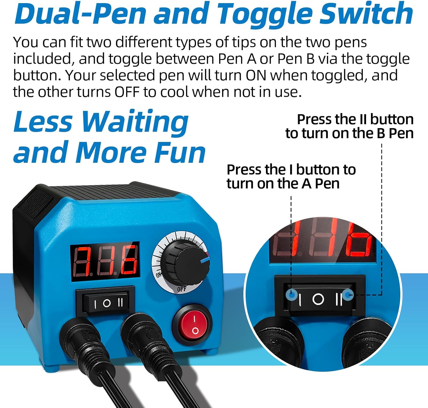 - DIGITAL ADJUSTABLE TEMPERATURE WOOD BURNING AND IRONING MACHINE: The wood burning kit is suitable for 110V voltage,The highest temperature can reach 750℃.It is a wood burning tool with temperature digital display function, which can accurately control temperature and finely depict the picture. There are three different types of firewood burning pens with different functional characteristics for drawing.The main advantage of metal wire pen tip is to depict lines, while the advantage of solid copper pen tip is to render color depth and color blocks.