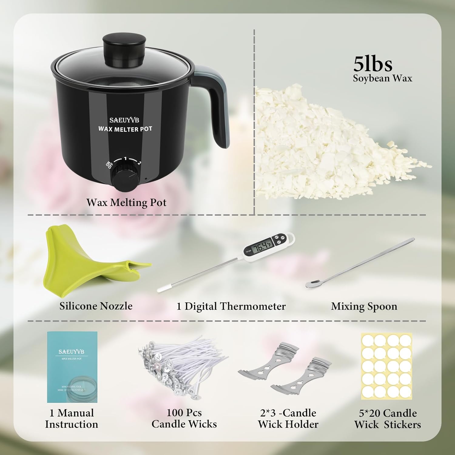 - 🎁【Candle Making Supplies】:Candle making kit includes wax melting pot,5lbs of natural soy wax,100 cotton candle wicks,2 stainless steel centering devices,100 candle wick stickers,1 thermometer,1 stainless steel spoon,1 silicone nozzle,1 instruction,DIY candle making kit supplies suit for beginners.