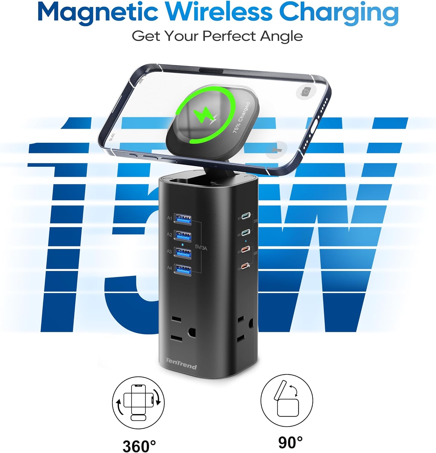 - 【One for All Charging Tower】Equipped with 3 AC Outlets, 4 USB-A ports, 4 USB-C ports (4*Fast charging port) and 1 manetic charging top, it is a multi-functional charging solution that can charge tablets, cellphones, iphone 14/15 or other devices at the same time.