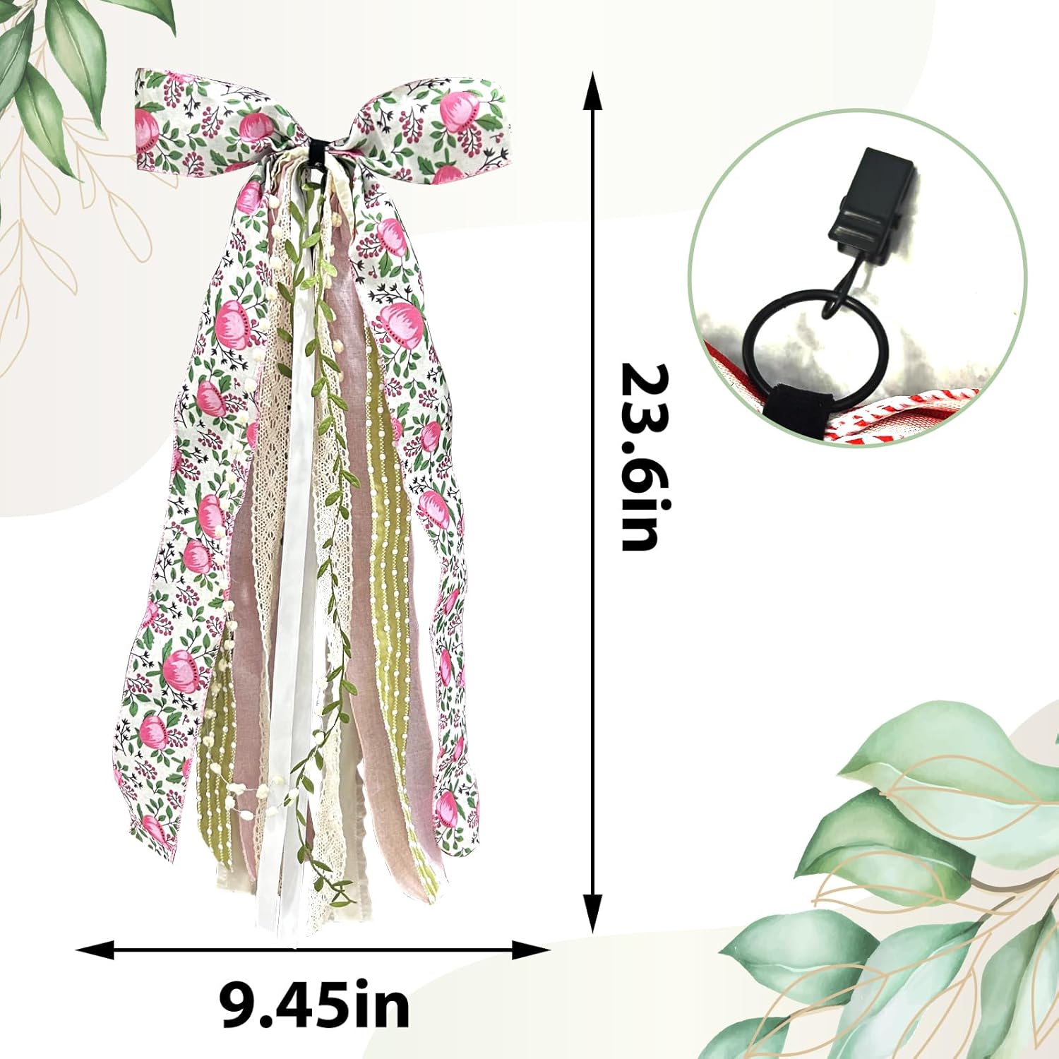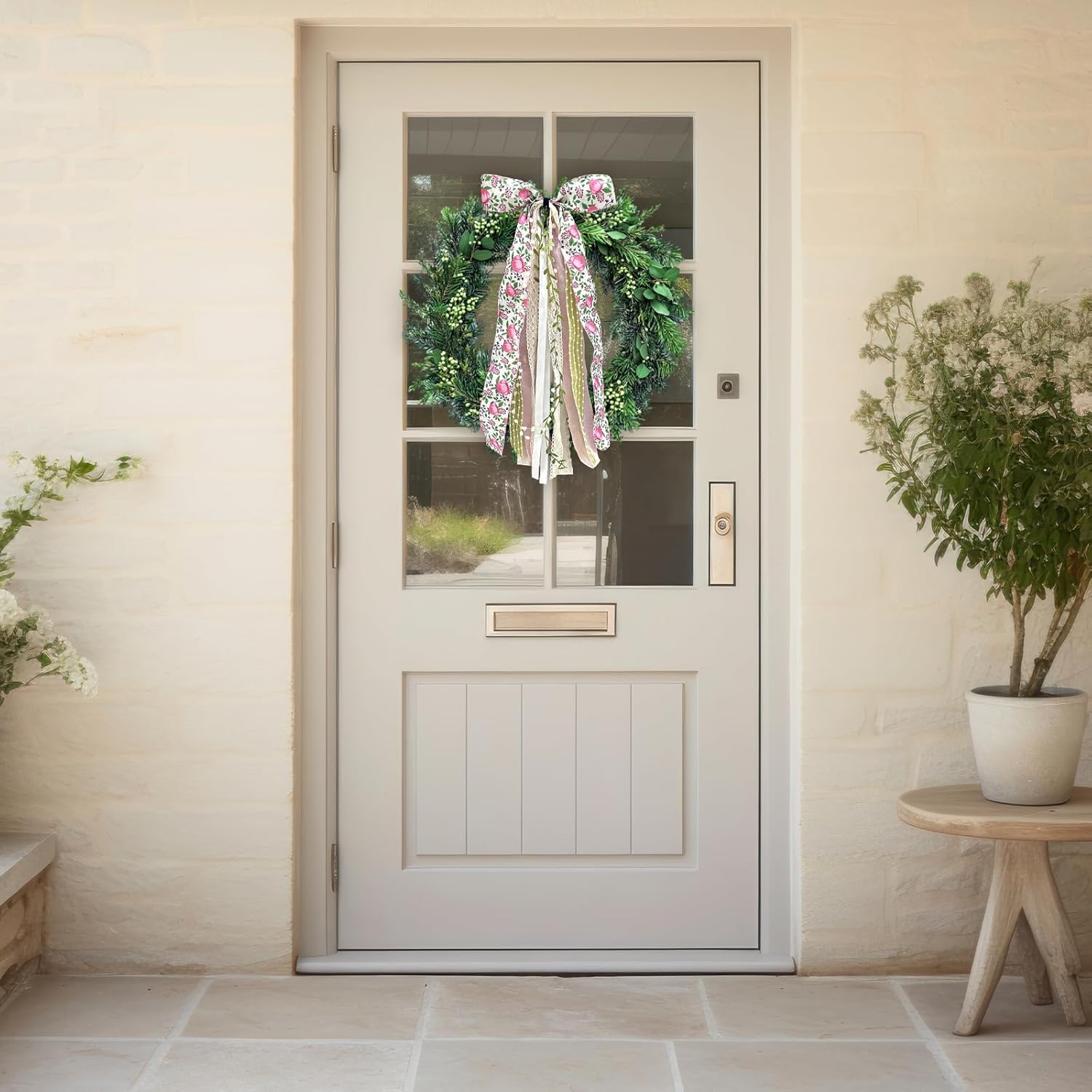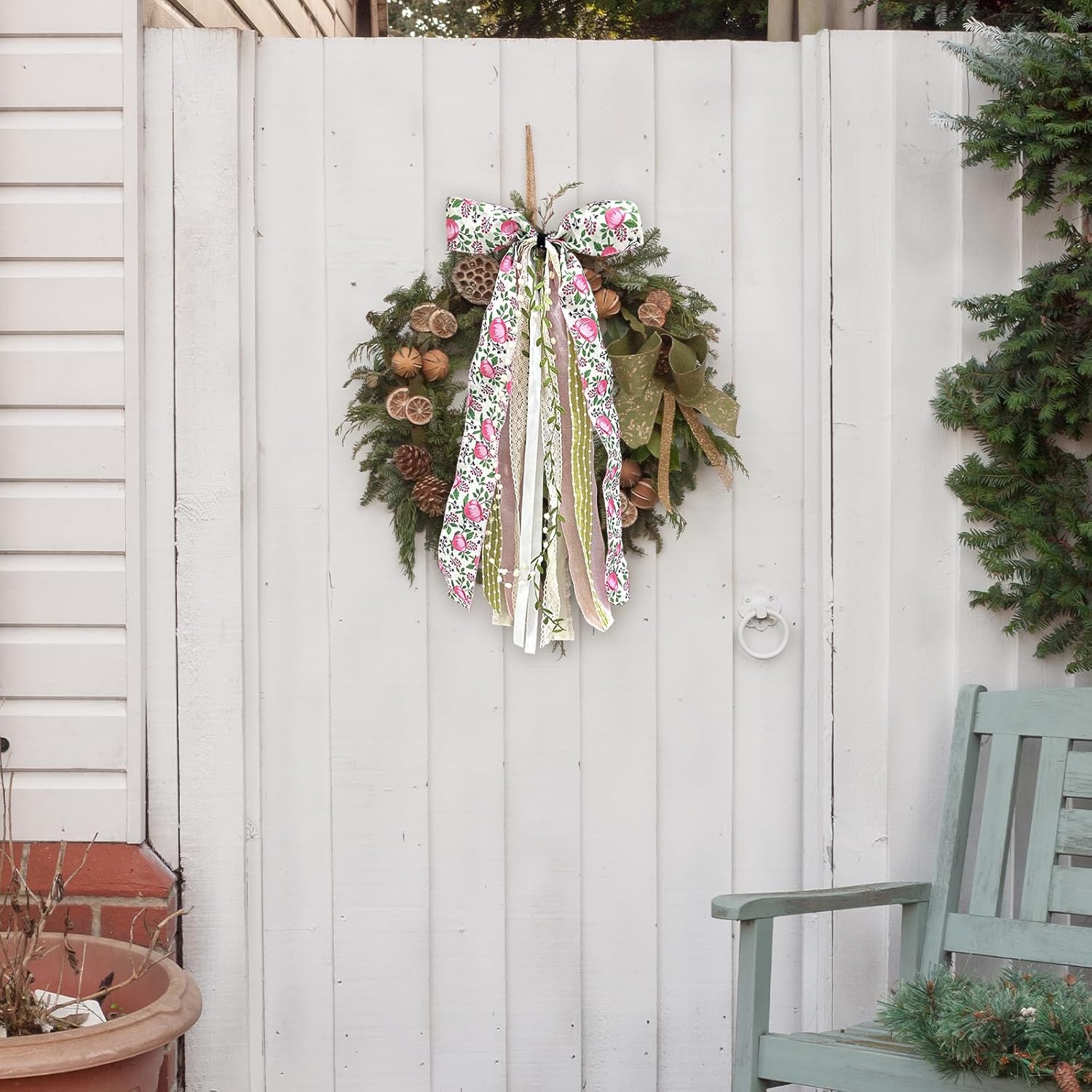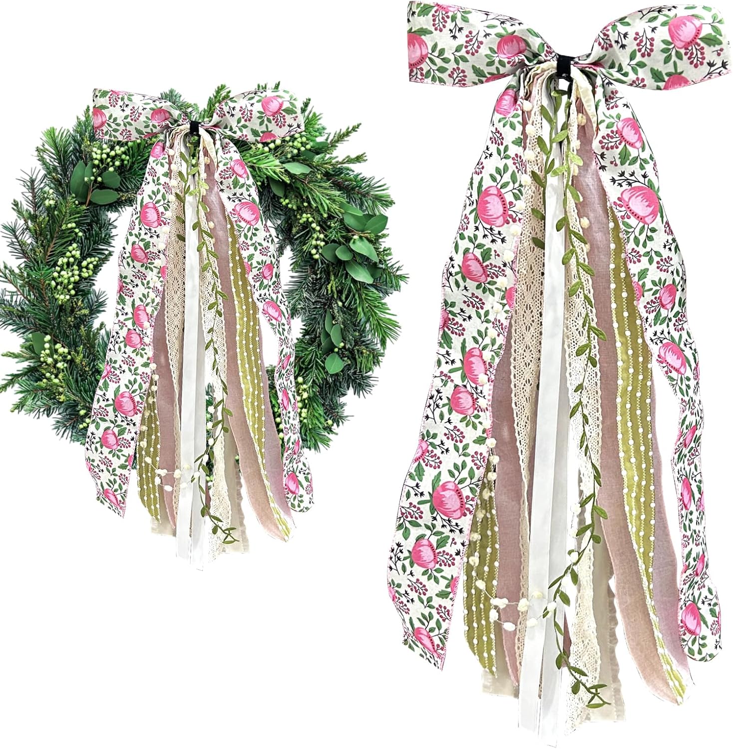 Large Flower Ribbon Bow for Wreath, Pink Floral Fabric Ribbons Set Assorted Leaves Lace Ribbon Green Dot Clip-On Wreath Sash Ribbons Bundle for Home Indoor Outdoor Decor